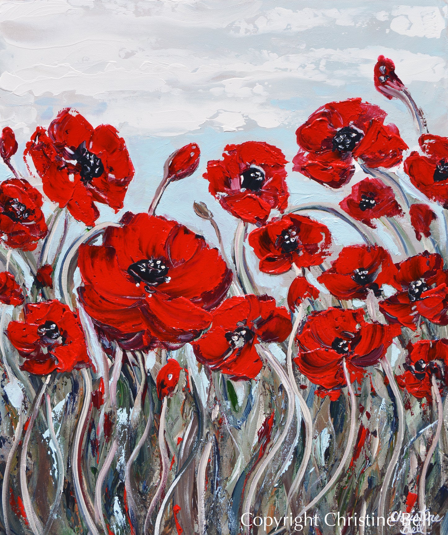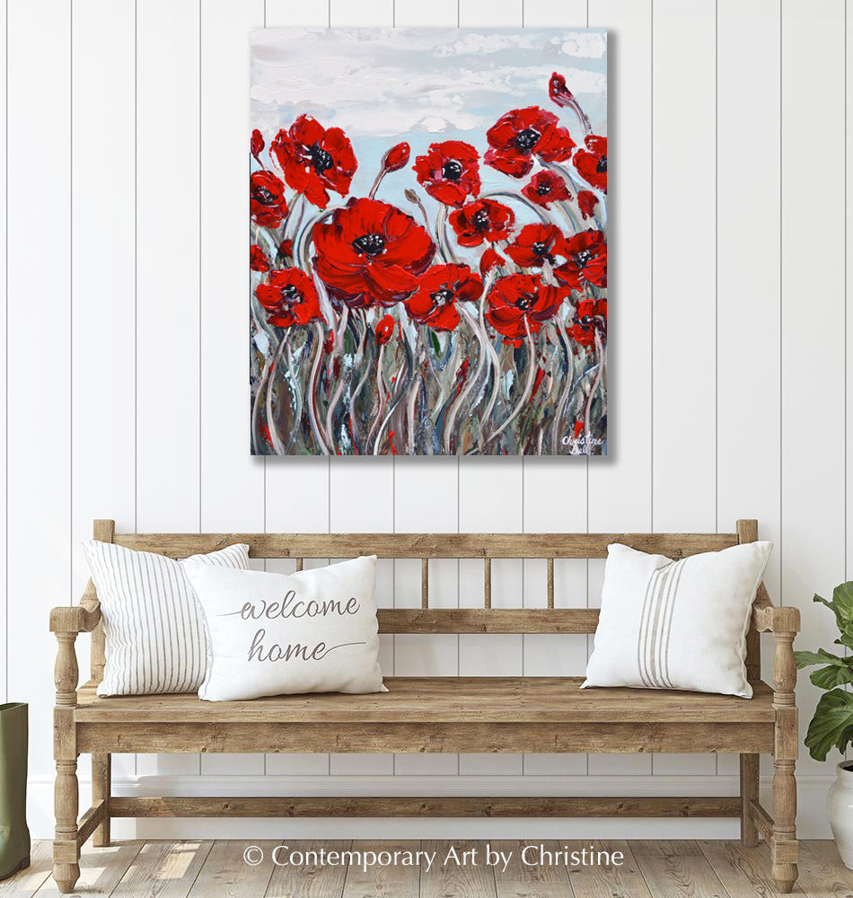 "Blossoming Beauty" Original Abstract Floral Painting Red Poppy Flowers Fine Art. Modern, expressionist delicate flowers painting. Stunning abstract poppies floral containing movement and light of a poppy field, with contemporary neutral palette of red, crimson, brown, grey, green, blue and white. Abundantly blossoming flowers, romantic poppies, seem to dance in their surroundings. Gallery fine art, wall decor. Mixed media acrylic and oil original painting on a 20x24x1.5" gallery wrapped canvas. Hand-painted, one-of-a-kind. Beautiful, vibrant, wonderful, unique technique! The sides of the canvas are painted grey so your new painting is ready to hang! (Sides can also be black if that better matches your taste.)  The visual quality of this textured, palette knife painting is stunning in both indoor, and natural light. Each painting purchased comes with a signed and dated Certificate of Authenticity verifying that this is an original piece of art created by internationally collected artist, Christine Bell, (formerly Christine Krainock).
