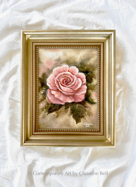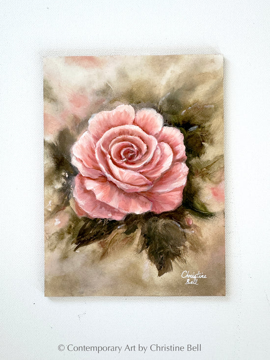 "Pretty Lady" Original Art Floral Pink Rose Oil Painting. Beautiful rose painting, botanical. classic Fine Art depicting elegant pink, english rose in full bloom, on 6x8" wood panel. Inspired by English Garden Roses in bloom, this floral painting is painted in serene shades of fresh blush pinks, peach, rose, green and white on a soft beige, taupe, cream background. Elegant, classic, gallery fine art. A stunning, beautiful piece of artwork