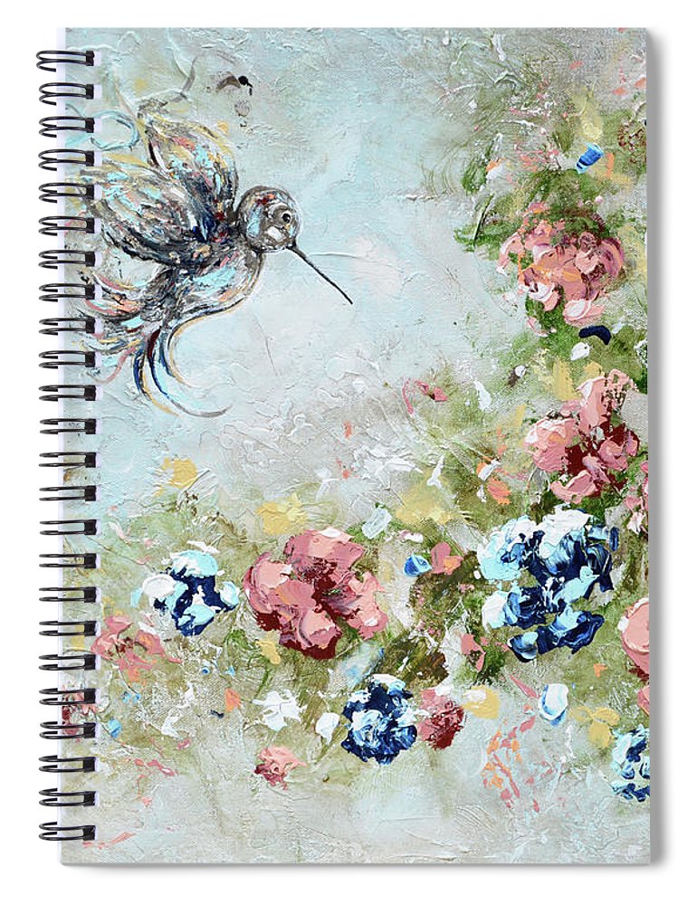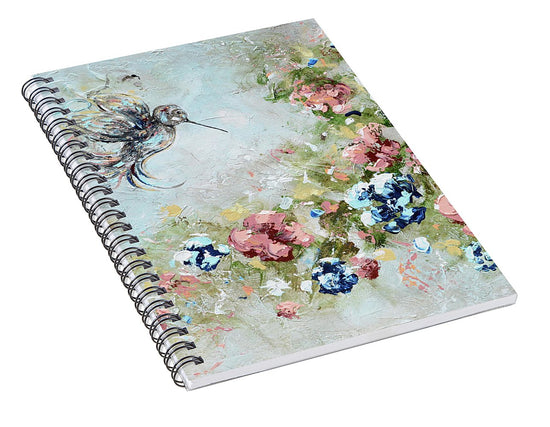 "Bringing Light and Love" Hummingbird Notebook / Journal, Flower Garden. Floral Nature Art by Artist, Christine Bell. Makes a wonderful gift! Our spiral notebooks are 6" x 8" in size and include 120 pages which are lined on both sides. The artwork is printed on the front cover which is made of thick paper stock, and the back cover is medium gray in color. The inside of the back cover includes a pocket for storing extra paper and pens.