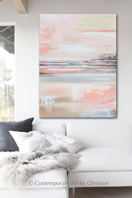 "Romantic Impressions" Original Coastal Abstract Painting  inspired by the warm colors and textures of the warm, rosy, coastal sky and sand at sunrise and sunset. Modern, Impressionism fine art painting in shades of warm beige, grey, cream, rose pink, peach, and white. Contemporary, large, TEXTURED palette knife, neutral wall art, coastal home decor. Hand-painted, one-of-a kind, original painting with a calm, serene coastal feel. Mixed media acrylic on 30x40x1.5" canvas. Beautiful organic, natural effect, in minimalistic abstract form. Beautiful, vibrant, romantic feel! The sides of the canvas are painted grey, so your new painting is ready to hang! (Sides can be painted black if it better suits your tastes.) The visual quality of this textured, painting is stunning in both indoor, and natural light. Each painting purchased comes with a signed and dated Certificate of Authenticity verifying that this is an original piece of art created by internationally collected artist, Christine Bell (formerly Christine Krainock).