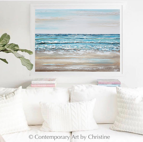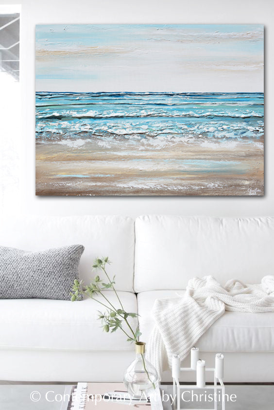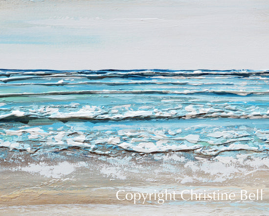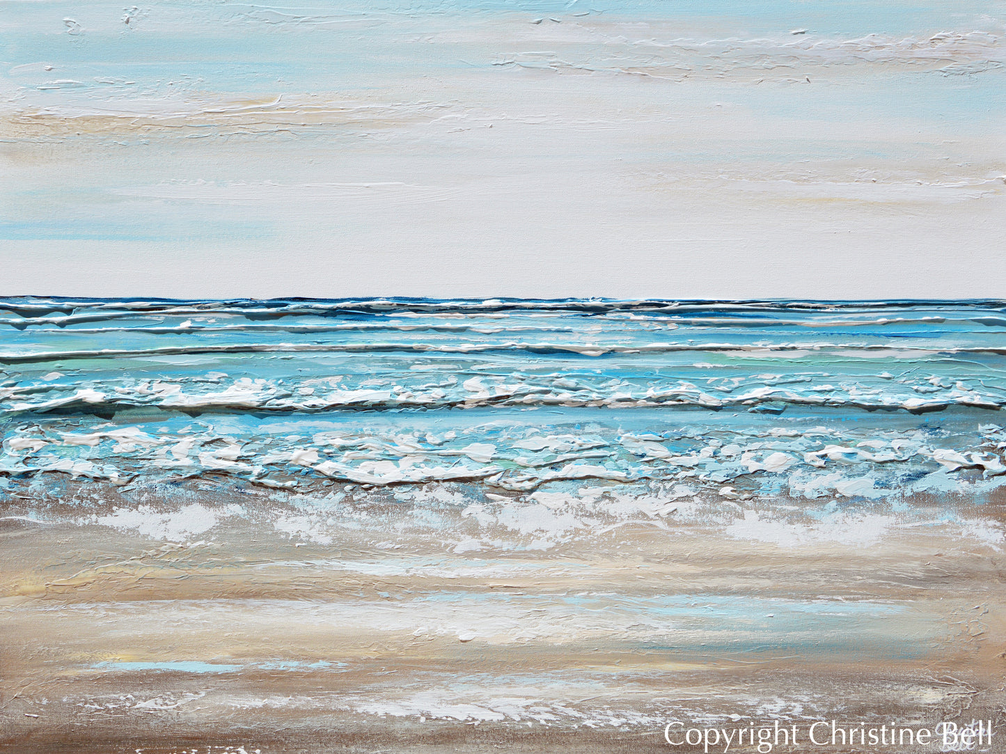 "Float with the Tide" Original Art Abstract Painting Textured Seascape. Stunning, as the serene shades of soft aqua blue and the HIGHLY TEXTURED layers of paint seem to take on the depth, calm colors and relaxed feel of the coast, sea and gentle waves in abstract form. TEXTURED, modern, California, coastal, gallery fine art. Beautiful organic, abstract, seascape, landscape, contemporary, large, wall art, perfect for contemporary coastal style / modern home decor. Modern palette knife painting with serene, pale aqua blue, light blue, turquoise, sea green, sandy beige, and white, with deep layered texture giving this piece a modern yet peaceful effect. Mixed media acrylic on a large 40x30x1.5" gallery wrapped canvas. Hand-painted, one-of-a-kind. Beautiful, vibrant, sure to be the focal point of any room decor! The sides of the canvas are painted grey, so your new painting is ready to hang! (You may request to have the sides changed to black if that better suits your taste.) The visual quality of this textured, painting is stunning in both indoor, and natural light - PHOTOS CANNOT DO NOT ADEQUATELY CAPTURE THE WONDERFUL TEXTURE, DETAIL AND FEEL OF THIS PAINTING. Each painting purchased comes with a signed and dated Certificate of Authenticity verifying that this is an original piece of art created by internationally collected artist, Christine Bell (formerly Christine Krainock).