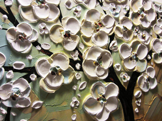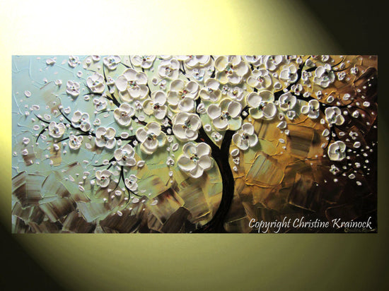 "Spring Daydreams" -CUSTOM White flower blooming tree of life modern cherry tree painting original textured palette knife flowers landscape floral light blue brown mixed media acrylic on gallery wrapped canvas.  Inspired by the blossoming trees full of abundant, beautiful blossoms... daydreaming as the soft petals blow off the branches and drift on the wind.
