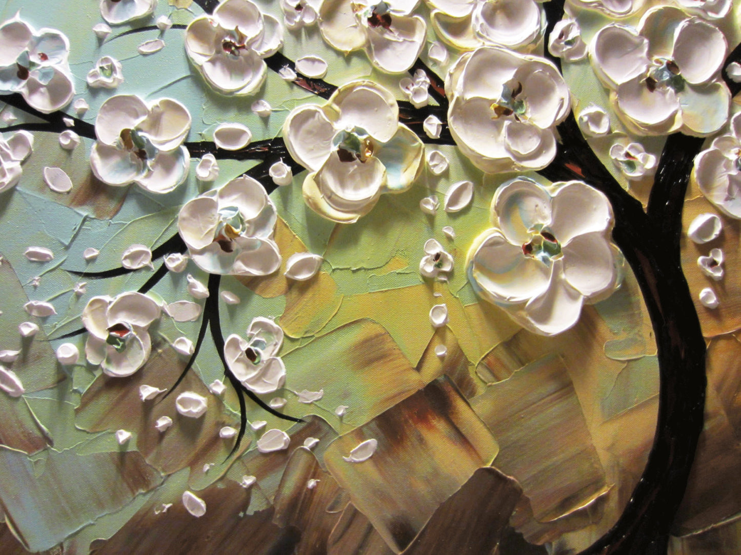 Original Art Abstract Painting White Cherry Tree Blossoms Flowers Textured Blue Brown Gold