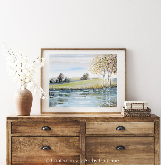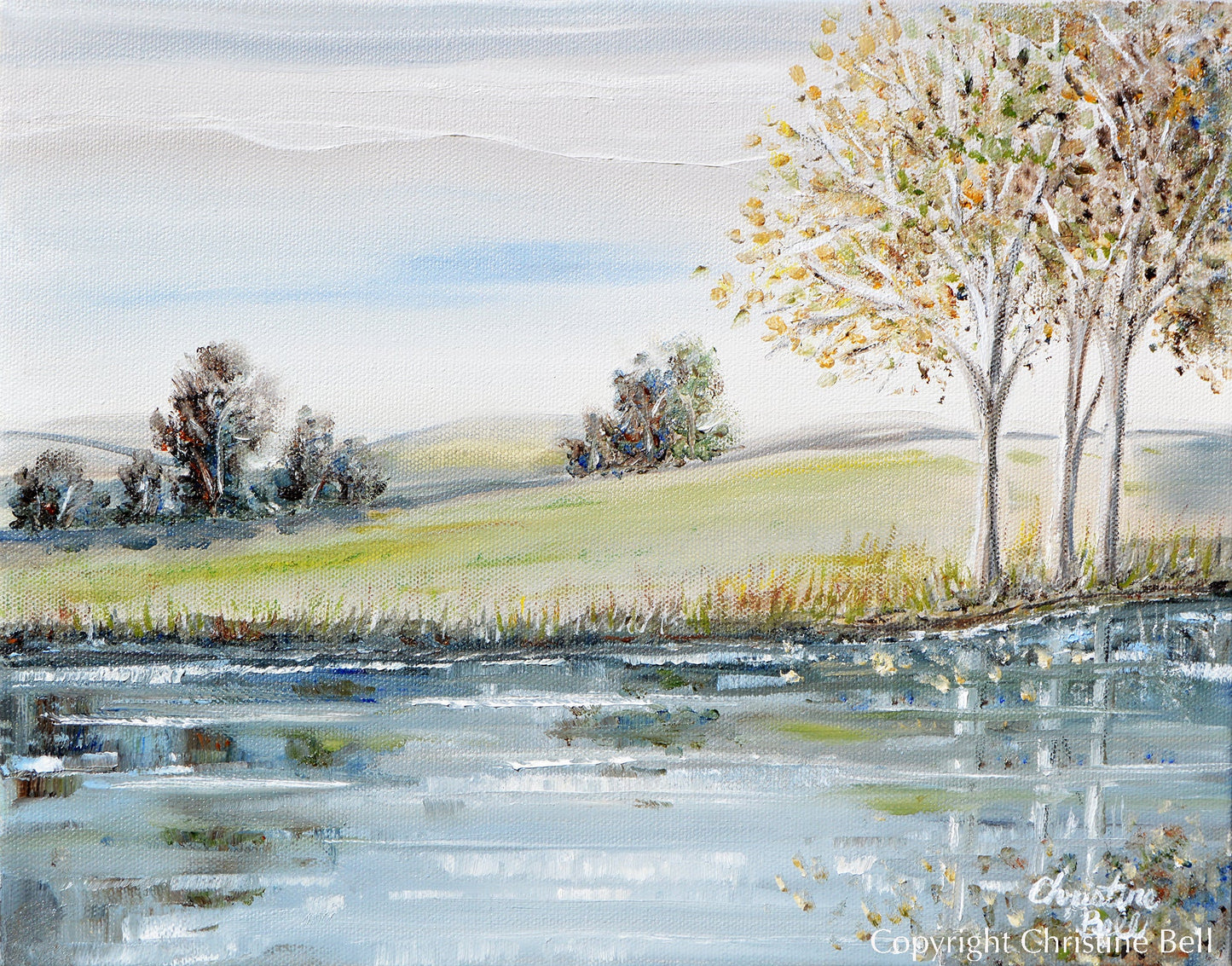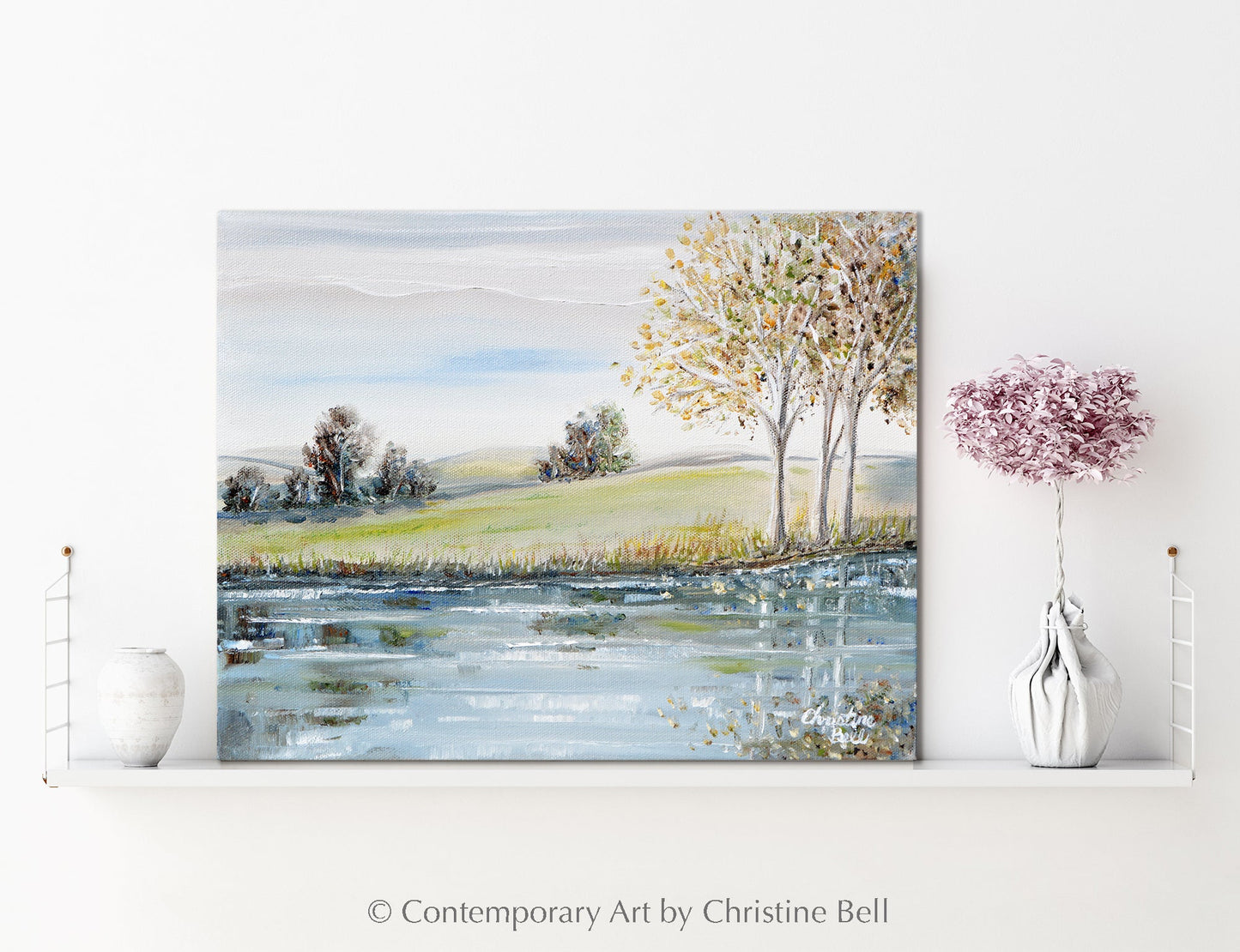 "A Moments Reflection" ORIGINAL Art Abstract Landscape Oil Painting. A stunning modern impressionist landscape that draws the viewer in through the reflections upon the shimmering water / lake, across the meadow and to the trees and horizon beyond. Mesmerizing, as the detail captures light playing on the water and within the autumn trees' leaves to where the viewers mind can wander almost hearing birds and the whispers of the soft breeze through the trees and grasses. Created in the serene shades of relaxing earthy tones of greens, blues, brown, grey, cream and white. The impasto layers of paint take on the depth, and relaxed atmospheric feel of the beautiful meadow and trees, fresh air and country calmness.