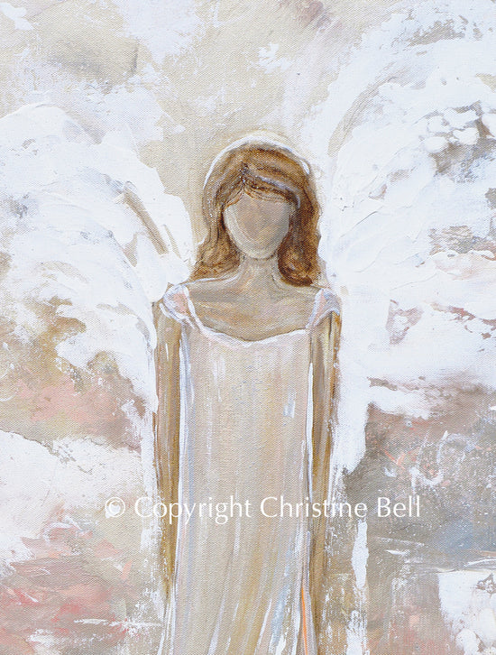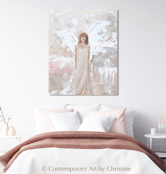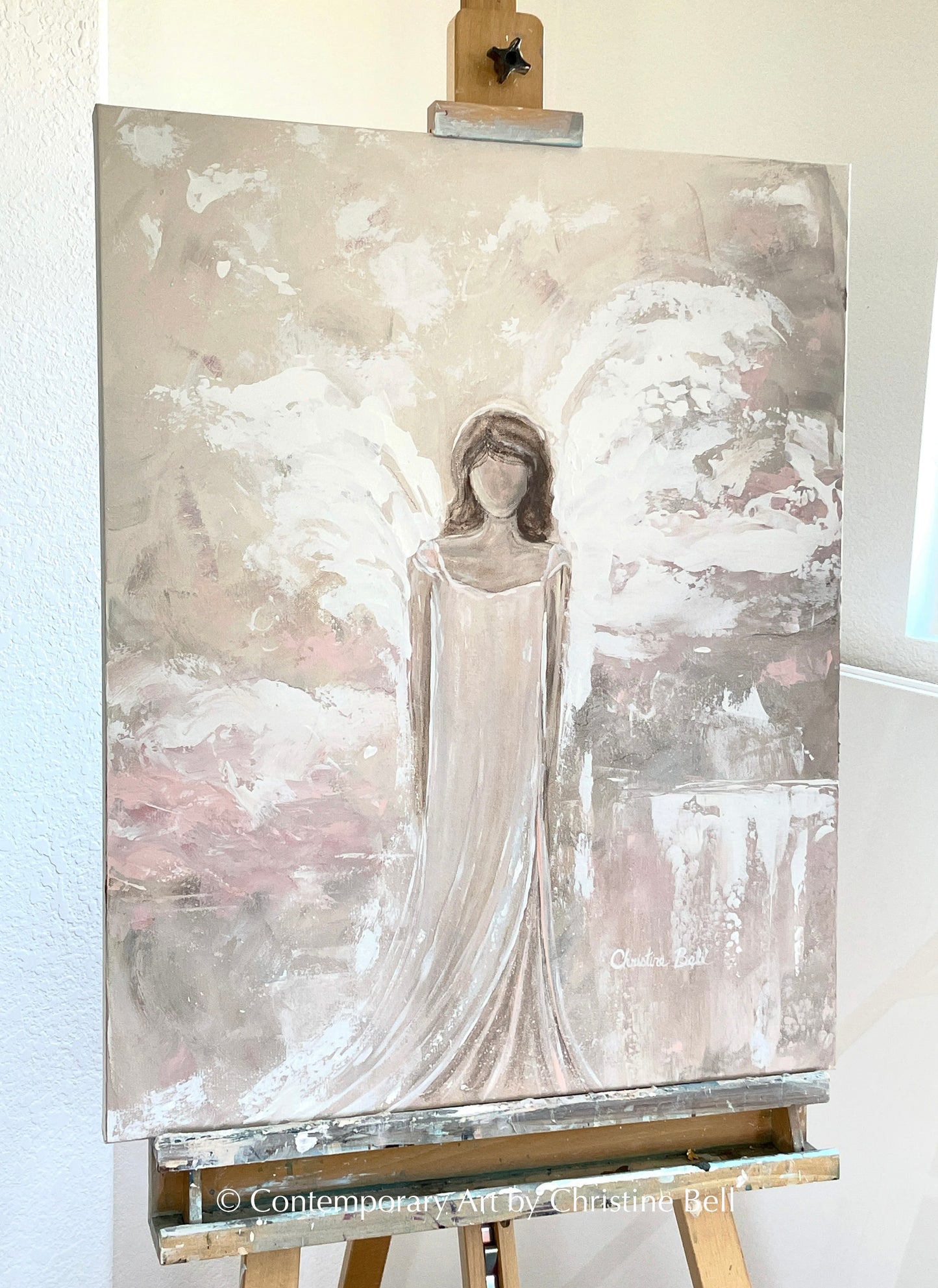 "Angel of Strength" ORIGINAL Angel Painting. Contemporary Guardian Angel Fine Art on 24x30" Gallery Stretched Canvas in warm shades of beige, cream, grey, white and pink. This contemporary, abstract, spiritual angel wraps you in strength and courage with the knowledge that she is with you. This ORIGINAL contemporary, abstract, spiritual angel has been painted by hand with palette knife and brush in charcoal, acrylic and oil. It is a one-of-a-kind, collectable, fine art original painting; one of Christine's Original Signature Angel Paintings created especially for, and in collaboration with "Life's About Change™".