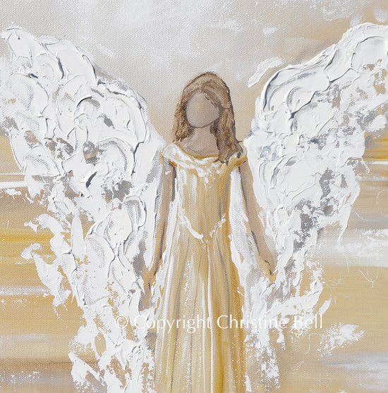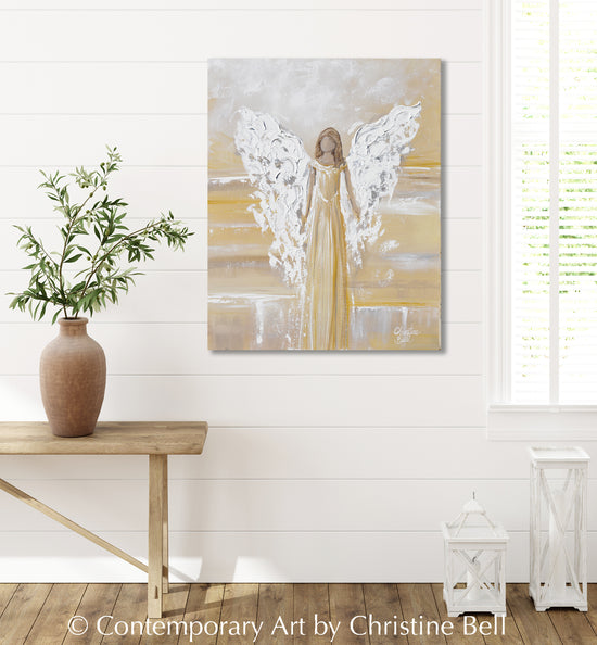 "Bringing Light and Joy" ORIGINAL Angel Painting of an elegant guardian angel providing peaceful joy and comfort. Painted in subtle, soothing shades of grey, pale gold, warm cream, and white. This 16x20" Original, TEXTURED, modern angel painting exudes a sense of gentle calm, light and peace, a comforting, beautiful piece of spiritual fine art. This contemporary, abstract angel has been painted by hand with palette knife and brush in mixed media acrylic and oil. It is a one-of-a-kind, collectable, fine art original painting; one of Christine's Original Signature Angel Paintings.