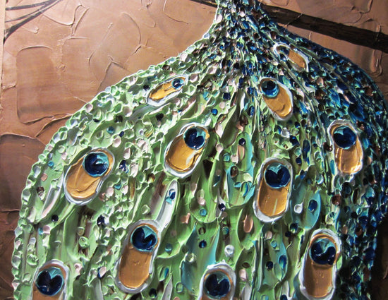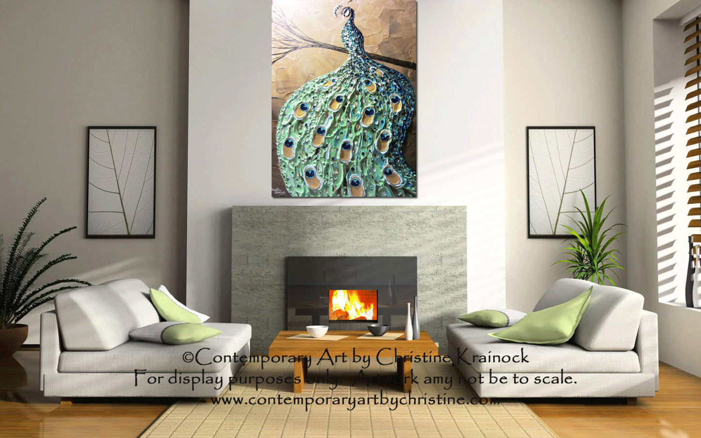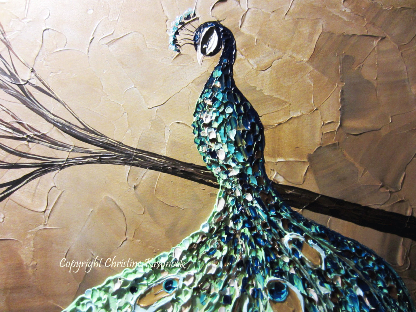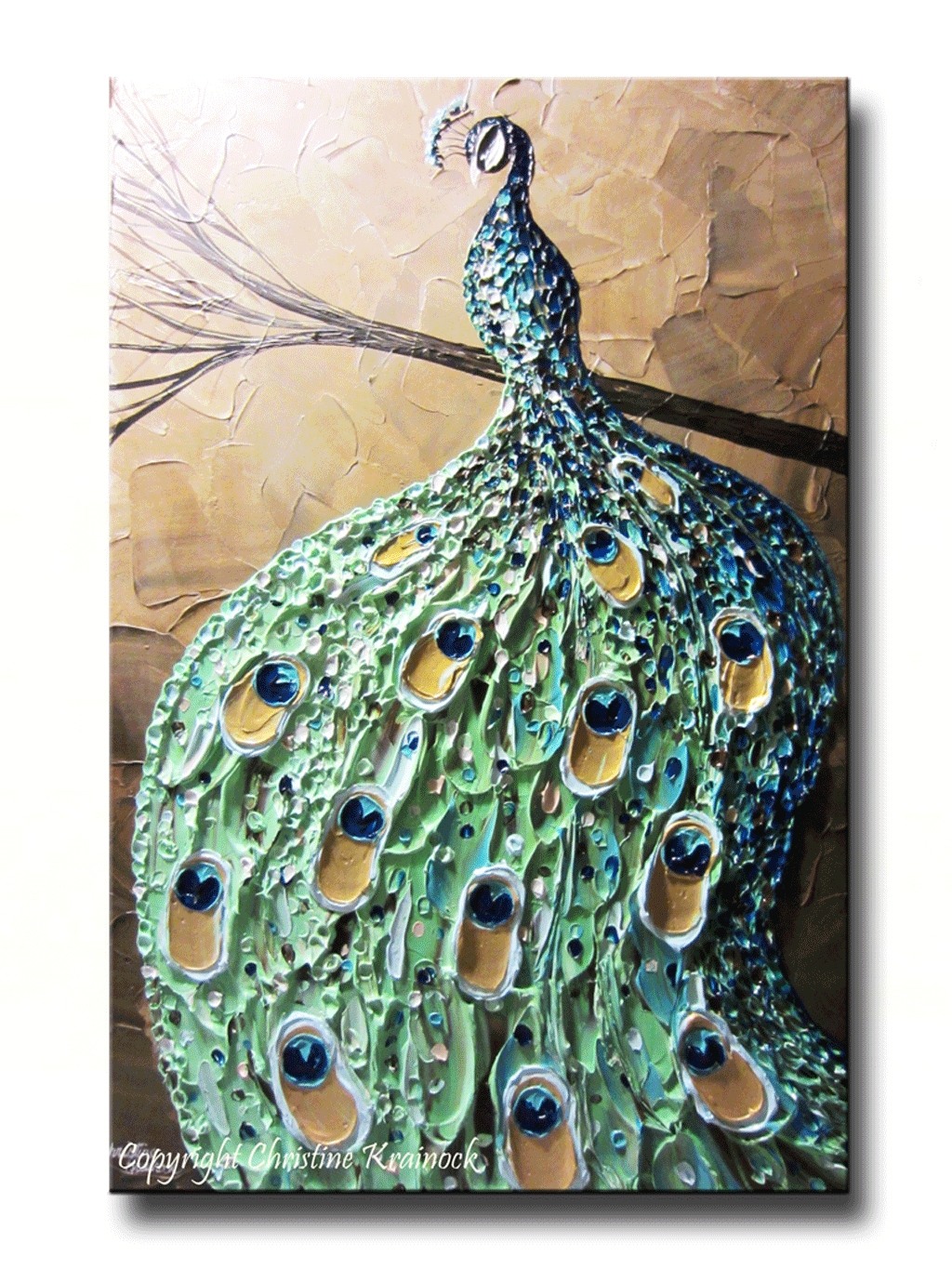 "Elegant Peacock" -Original CUSTOM MADE modern abstract peacock painting textured blue green peacock bird w/ feathers palette knife fine art gallery artwork w/ metallic gold, impasto style - Original painting, contemporary, modern, textured palette knife mixed media acrylic gallery painting. Hand-painted, one-of-a-kind. Beautiful, vibrant, wonderful texture! Mixed media acrylic on gallery wrapped canvas. The sides of the canvas are painted black so your new painting is ready to hang! The visual quality of this original painting with it's textured detail is stunning in both indoor, and natural light. The metallic accents in this painting are stunning under a directional light. Each painting purchased comes with a signed and dated Certificate of Authenticity verifying that this is an original piece of art created by internationally collected artist, Christine Krainock.