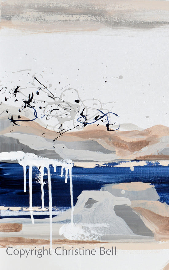 "Desert Oasis" Original Art Abstract Painting, Navy Blue and White, Abstract, Neutral Contemporary Fine Art, Palette Knife Painting. Allow your mind to settle and you gaze upon the colors and textures of this expressionist abstract - glimpsing soulful impressions of land, air and water. Created in serene shades of cool navy blue, white, grey, taupe and beige. The layers of paint seem to take on the depth, calm colors and relaxed feel of the land / coast in contemporary expressionistic abstract form. Modern, Urban, California, coastal, gallery fine art. Beautiful extra large, wall art, perfect as the focal point piece of contemporary coastal / modern home or office decor. Modern painting created by palette knife in Christine's signature style, giving this piece a stunning yet peaceful effect. Mixed media acrylic on a 30x30x1.5" gallery wrapped canvas. Hand-painted, one-of-a-kind. The sides of the canvas are painted grey, so your new painting is ready to hang! (You may request to have the sides changed to black if that better suits your taste.) The visual quality of this textured, painting is stunning in both indoor, and natural light - PHOTOS CANNOT DO NOT ADEQUATELY CAPTURE THE WONDERFUL TEXTURE, LIGHT, DETAIL AND FEEL OF THIS PAINTING. Each painting purchased comes with a signed and dated Certificate of Authenticity verifying that this is an original piece of art created by internationally collected artist, Christine Bell (formerly Christine Krainock).