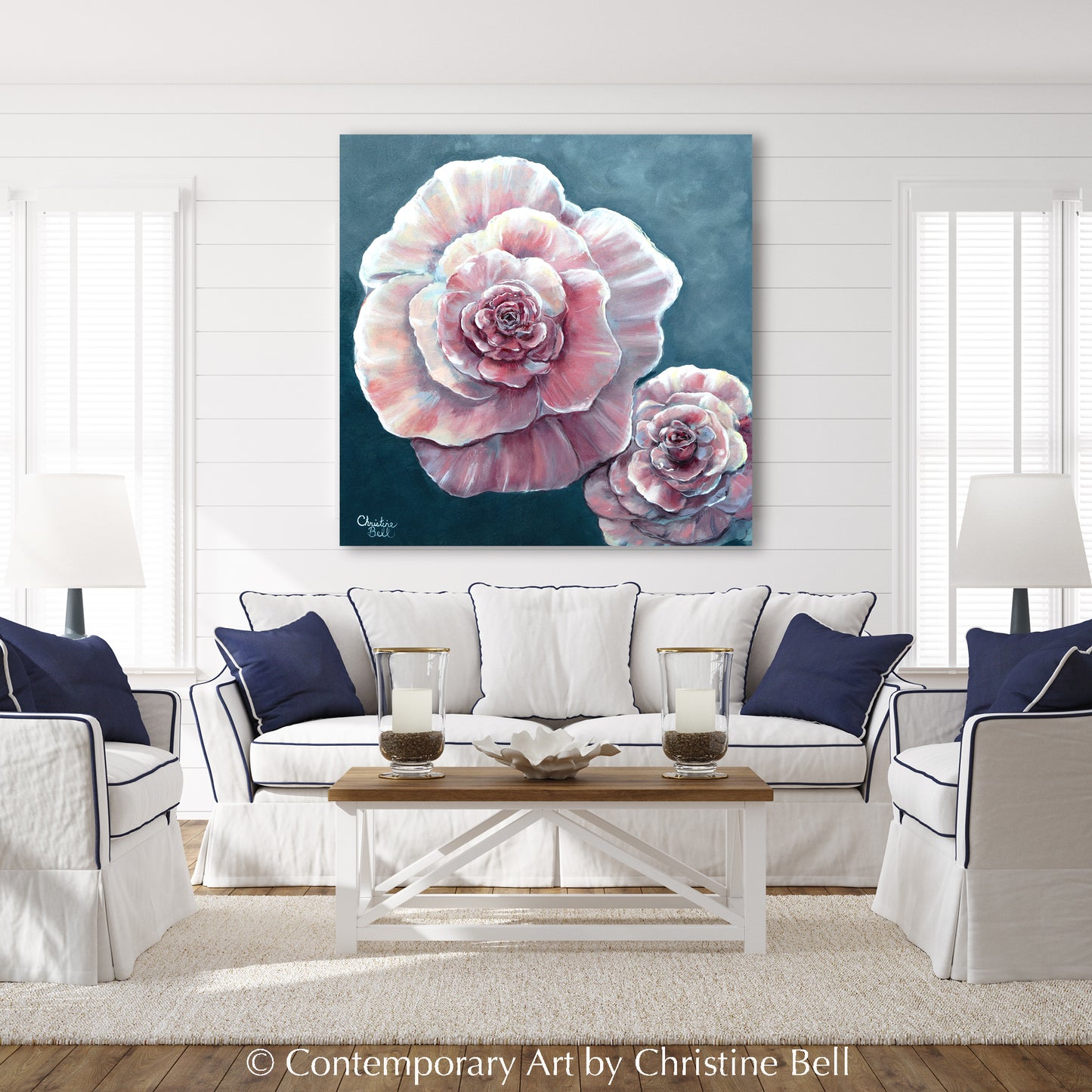 "Full Bloom" Original Art Floral Oil Painting. Modern Botanical Fine Art depicting Large Blush Pink Roses / Flowers blossoming in full bloom, 24x24". The flowers have an almost 3-D realism effect, creating an absolutely gorgeous oil painting. Inspired by springtime roses in bloom, this modern, expressionist, realism floral painting is painted in serene shades of fresh blush pinks, peach, periwinkle, soft yellow and white on a steel blue-grey background. Contemporary, modern, expressionism, gallery fine art. A stunning, beautiful piece of artwork perfect for contemporary coastal style / modern home decor.