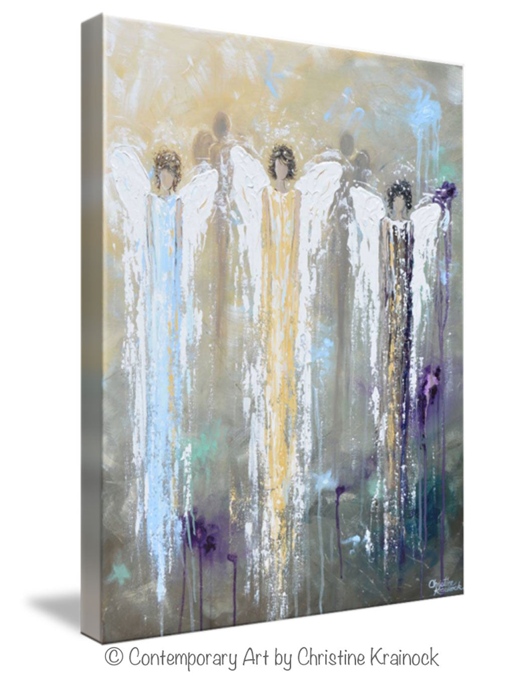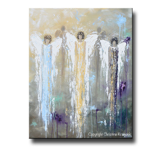 "Angels of Grace" Giclee Print / Canvas Print of original art, abstract, guardian angels painting depicting three stunning angels guarding, protecting, providing comfort.  This hand-painted, contemporary, figurative piece possesses not only a comforting sense of peace and calm, but with its' layers of paint, also contains a modern, stylish, organic feel, perfect for any decor. Created with a palette of white, grey, taupe, pale gold, beige, pale blue, brown, with accents of navy and purple. The original of this spiritual, modern, textured, palette knife figurative was mixed media acrylic on 24x30x1.5" gallery wrapped canvas, and although prints do not contain the texture of an original painting, it is otherwise identical in colors and feel. Hand-painted, one-of-a-kind, beautiful, vibrant, full of depth! If you select canvas prints, the sides will have a soft blurred edge of the paintings colors and will arrive ready to hang! The visual quality of this painting is stunning in both indoor, and natural light.