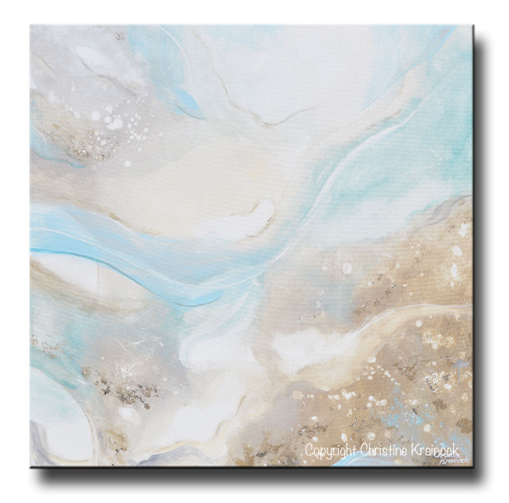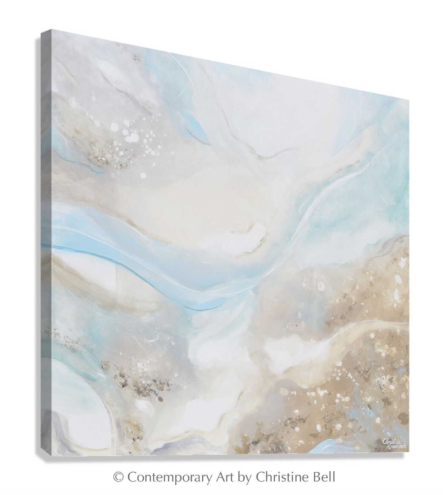 "Swept Away" Giclée Print / Canvas Print of Original Art Soft Pale Aqua Blue Sea Foam Green Grey Abstract Painting. Stunning, as the viewers' eye follows the coastal inspired washes of color and depth throughout the canvas, - eliciting the calm, peaceful feeling of being "Swept Away" into a relaxed, "vacationing at the shore", state of mind. Contemporary, modern, California, coastal, gallery fine art with a minimalist feel. Beautiful organic, abstract, seascape, landscape, contemporary, large, wall art, perfect for modern coastal style / urban farmhouse home decor. Print of modern palette knife and brush painting with serene blue, sea foam green, mint, light blue, grey, taupe, beige, ivory and white giving this piece a calm, serene effect. Original SOLD painting is mixed media acrylic on gallery wrapped canvas - an original piece of art created by internationally collected artist, Christine Bell, (formerly, Christine Krainock). Can be hung vertically or horizontally.