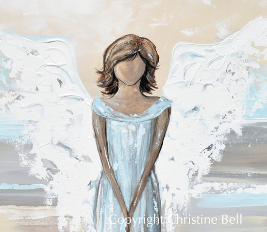 "Her Protecting Love is with You" - 30x40" ORIGINAL art, abstract, angel painting depicting a stunning, elegant guardian angel gently guiding and providing love, hope, and comfort. This hand-painted, palette knife, contemporary, spiritual piece possesses not only a comforting sense of love, grace and peace, but with its' soothing shades of contemporary colors & textured layers of paint, it also contains a modern stylish, classic feel, perfect for any decor. Created with a soft, neutral palette of pale light blue, cream, grey, ivory, taupe, and white. This spiritual, modern, textured, palette knife figurative was painted with mixed media acrylic on a large 30x40x1.5" gallery wrapped canvas. Hand-painted, one-of-a-kind. IMAGES CANNOT SUFFICIENTLY DIPICT THE STUNNING VISUAL QUALITY OF THIS PAINTING. Beautiful, vibrant, wonderful texture full of depth! The sides of the canvas are painted grey so your new painting is ready to hang! (Sides can be done in black if it better suits your tastes.) The visual quality of this textured, painting is stunning in both indoor, and natural light. Each painting purchased comes with a signed and dated Certificate of Authenticity verifying that this is an original piece of art created by internationally collected artist, Christine  Bell, (formerly Christine Krainock).
