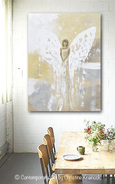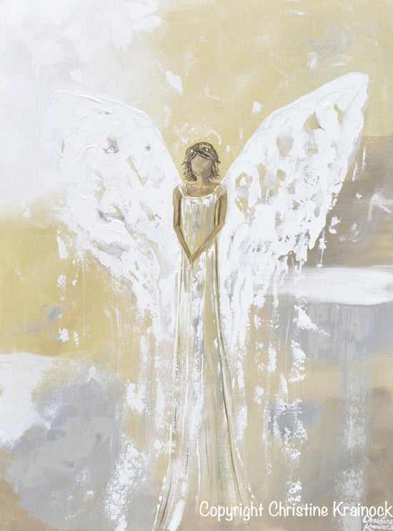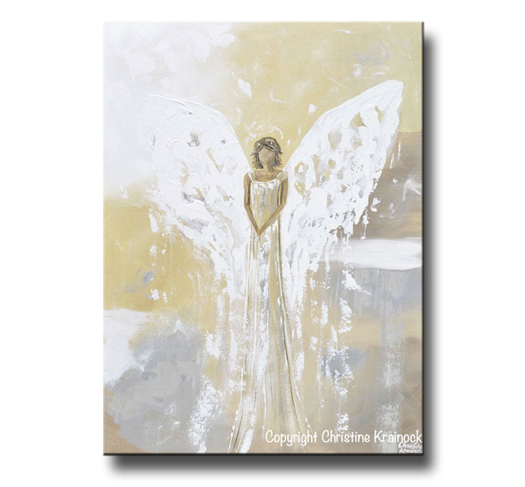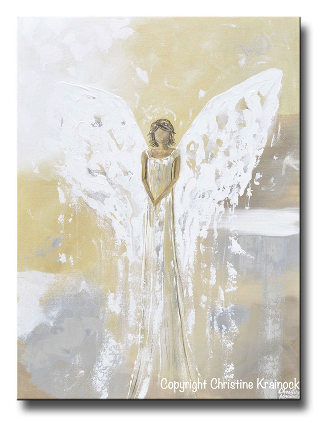 "Peaceful Angel" - 3ox40" ORIGINAL art, abstract, angel painting depicting a stunning guardian angel gently guiding and providing strength, love, hope, and comfort. This hand-painted, palette knife, contemporary, spiritual piece possesses not only a comforting sense of peace and calm, but with its' soothing shades of contemporary warm colors & textured layers of paint, it also contains a contemporary, stylish, classic feel, perfect for any decor. Created with a soft, neutral palette of pale grey, taupe, soft gold, beige, and white. This spiritual, modern, textured, palette knife figurative was painted with mixed media acrylic on an extra large 30x40x1.5" gallery wrapped canvas. Hand-painted, one-of-a-kind. IMAGES CANNOT SUFFICIENTLY DIPICT THE STUNNING VISUAL QUALITY OF THIS PAINTING. Beautiful, vibrant, wonderful texture full of depth! The sides of the canvas are painted black so your new painting is ready to hang! (Sides can be done in grey if it better suits your tastes.) The visual quality of this textured, painting is stunning in both indoor, and natural light. Each painting purchased comes with a signed and dated Certificate of Authenticity verifying that this is an original piece of art created by internationally collected artist, Christine Krainock.