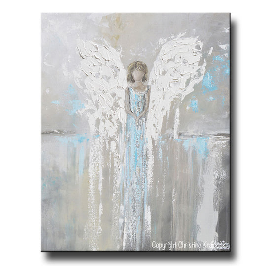 "Sweetest Angel" 24x30" ORIGINAL art, abstract, guardian angel fine art painting depicting delicate angel in vintage blue & white watching over & guiding. This hand-painted, contemporary, spiritual, piece possesses not only a comforting sense of peace, calm, & inspiration, but with its' soothing, pale ,natural shades & textured layers of paint, it also contains a modern, stylish, organic feel, perfect for any decor. Created with a palette of white, beige, grey, taupe, pale blue, aqua. This spiritual, modern, textured, palette knife figurative was painted with mixed media acrylic on 30x24x1.5" gallery wrapped canvas. Hand-painted, one-of-a-kind. IMAGES CANNOT SUFFICIENTLY DIPICT THE STUNNING VISUAL QUALITY OF THIS PAINTING. Beautiful, vibrant, wonderful texture full of depth! The sides of the canvas are painted black so your new painting is ready to hang! The visual quality of this textured, painting is stunning in both indoor, and natural light. Each painting purchased comes with a signed and dated Certificate of Authenticity verifying that this is an original piece of art created by internationally collected artist, Christine Krainock.