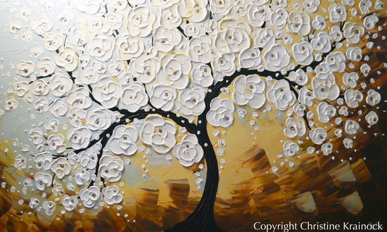 "Delicate Blossoms" Flowering Cherry Tree Painting -ORIGINAL White Cherry Blossoms Modern Tree of Life Painting. Blossoming flowers, textured, abstract palette knife painting, light blue, soft green, pale gold, brown, mixed media acrylic on large 36x60x1.5" gallery wrapped canvas. Hand-painted, one-of-a-kind. Beautiful, vibrant, wonderful texture! The sides of the canvas are painted black so your new painting is ready to hang! The visual quality of this textured, painting is stunning in both indoor, and natural light. Each painting purchased comes with a signed and dated Certificate of Authenticity verifying that this is an original piece of art created by internationally collected artist, Christine Krainock.