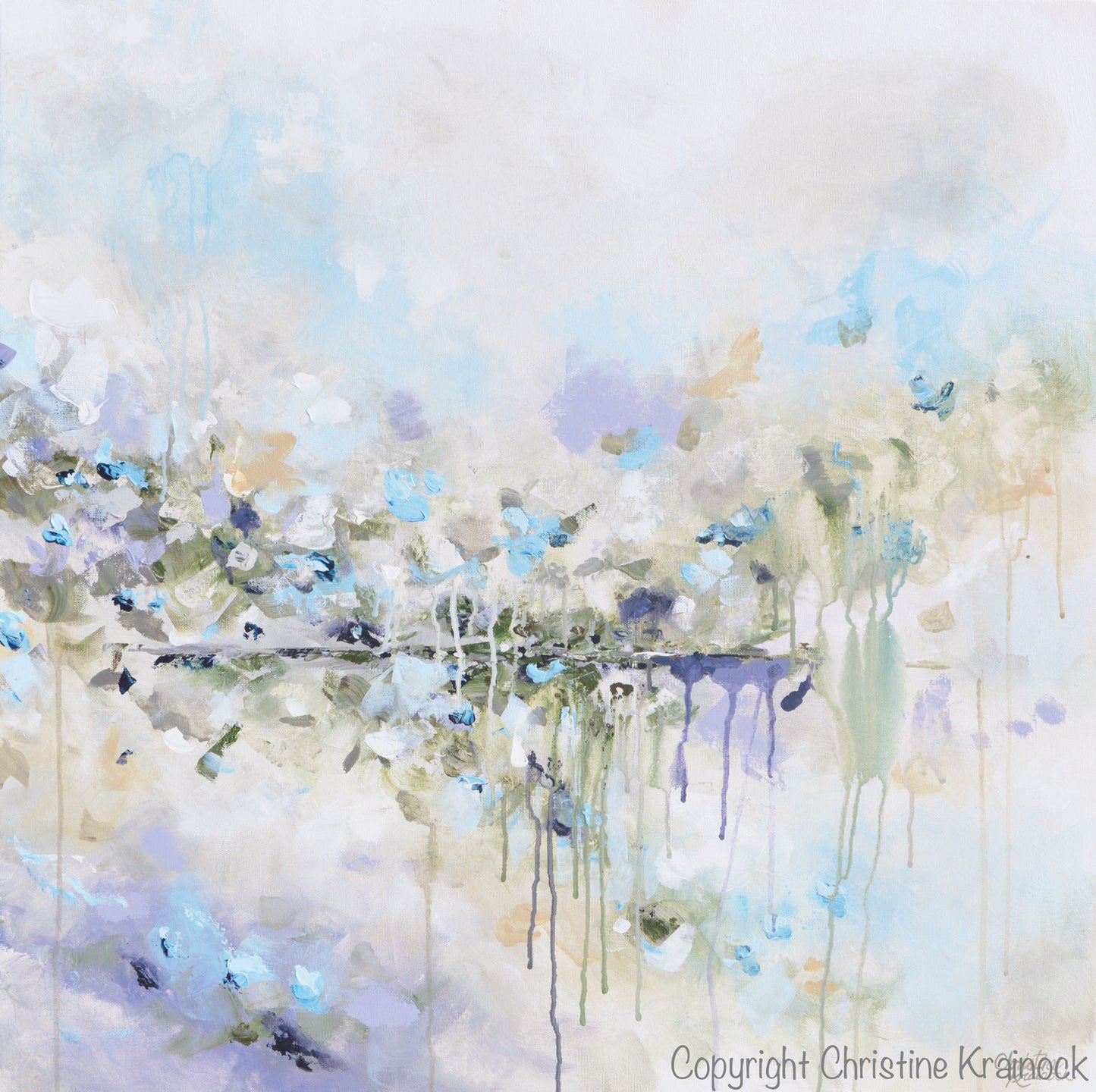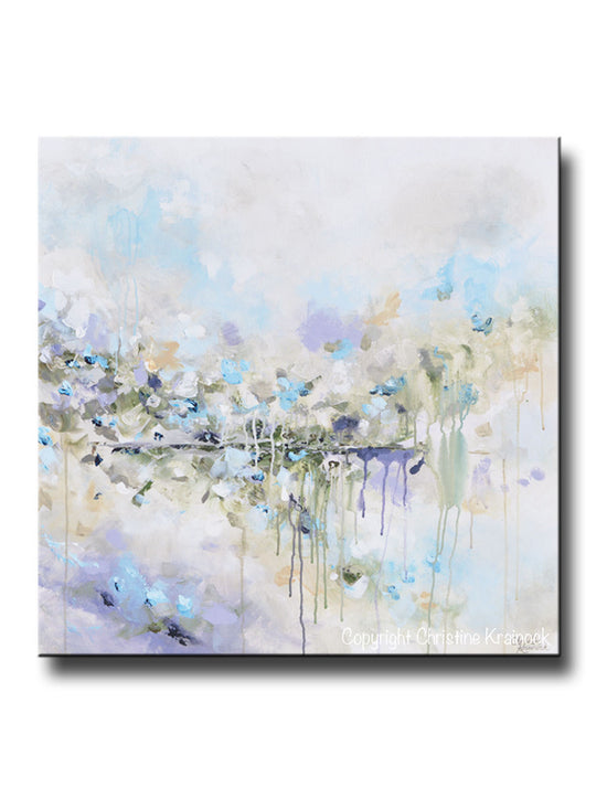 "Just Breathe II" Original Art Abstract Painting 30x30" Modern, Large Art, Wall Art, Coastal, Home Decor. textured, palette knife, abstract floral fine art with neutral muted shades of light turquoise blue, aqua, lavender, grey, taupe, beige, & white. This piece is part of a diptych, set of 2 canvases which together total 60x30" hung. Can be purchased as a single piece through this listing, or as the set, see link below for companion piece. Wonderful, tranquil feel.  Mixed media acrylic on a square 30x30x1.5" canvas. Beautiful organic, effect. Gallery wrapped canvas. The canvas can be hung any direction. Hand-painted, one-of-a-kind. Beautiful, vibrant, wonderful palette! The sides of the canvas are painted black, so your new painting is ready to hang! The visual quality of this painting is stunning in both indoor, and natural light. Each painting purchased comes with a signed and dated Certificate of Authenticity verifying that this is an original piece of art created by internationally collected artist, Christine Krainock.