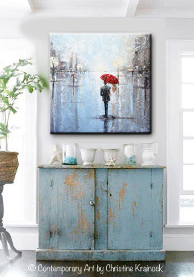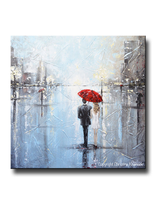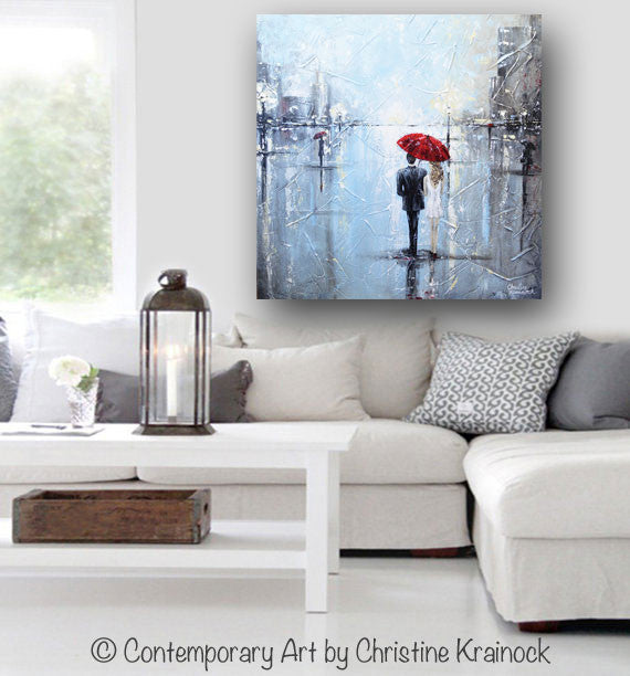 ORIGINAL Art Abstract Painting Couple Red Umbrella Girl White Grey Blue City Rain Modern Art