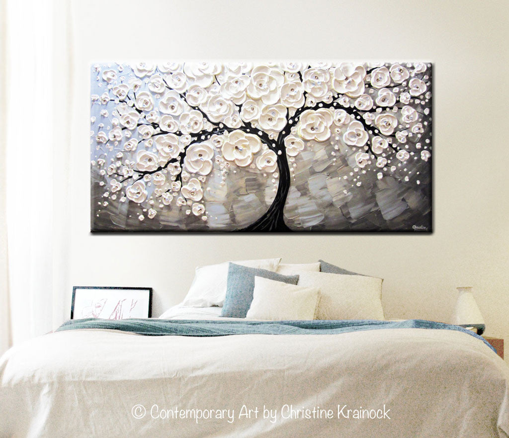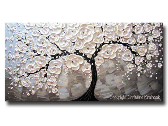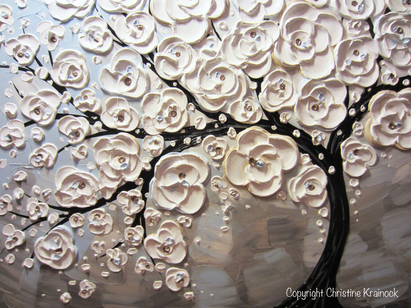 "Cherry Blossoms" -ORIGINAL White Cherry Tree of Life Painting blossoming cherry tree flowers textured abstract palette knife paintings blue grey taupe mixed media acrylic on large 24x48x1.5" gallery wrapped canvas. - brown, grey, taupe, pale blue, white, black, metallic bronze accents. - Hand-painted, one-of-a-kind. Beautiful, vibrant, wonderful texture! The sides of the canvas are painted black so your new painting is ready to hang! The visual quality of this textured, painting is stunning in both indoor, and natural light. Each painting purchased comes with a signed and dated Certificate of Authenticity verifying that this is an original piece of art created by internationally collected artist, Christine Krainock