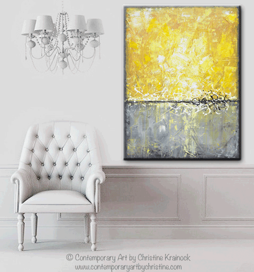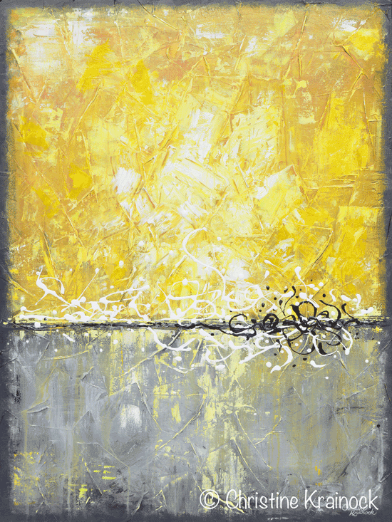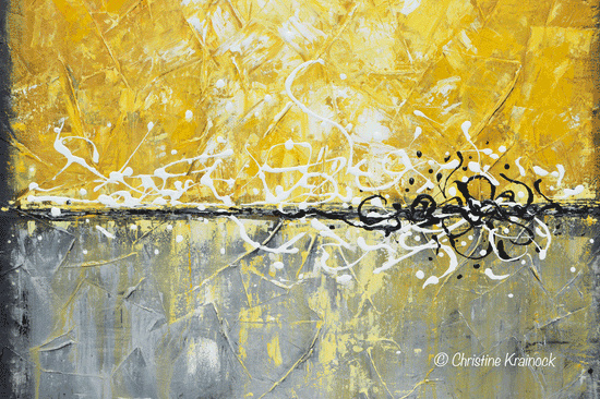 "Coastal Serenity" Original Art Yellow Grey Abstract Painting Contemporary Palette Knife Paintings. Textured sculpted white grey yellow gold art wall decor art Mixed media acrylic Original shown on 30x40x1.5" Gallery wrapped canvas. Can be hung vertically or horizontally.- Hand-painted, one-of-a-kind. Beautiful, vibrant, wonderful texture! THE STUNNING, UNIQUE EFFECTS AND WONDERFUL TEXTURE CANNOT BE ADEQUATELY CAPTURED IN PHOTOS. The sides of the canvas are painted black so your new painting is ready to hang! The visual quality of this textured, painting is stunning in both indoor, and natural light. Each painting purchased comes with a signed and dated Certificate of Authenticity verifying that this is an original piece of art created by internationally collected artist, Christine Krainock.