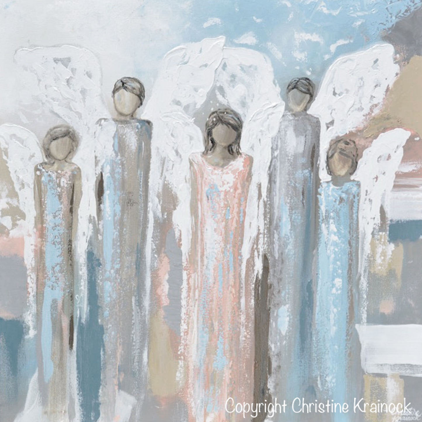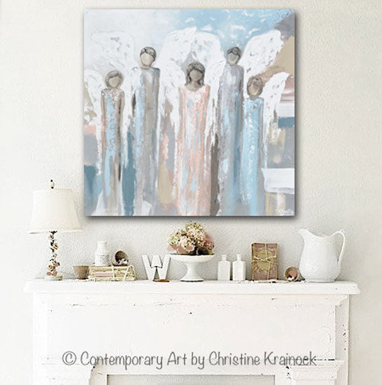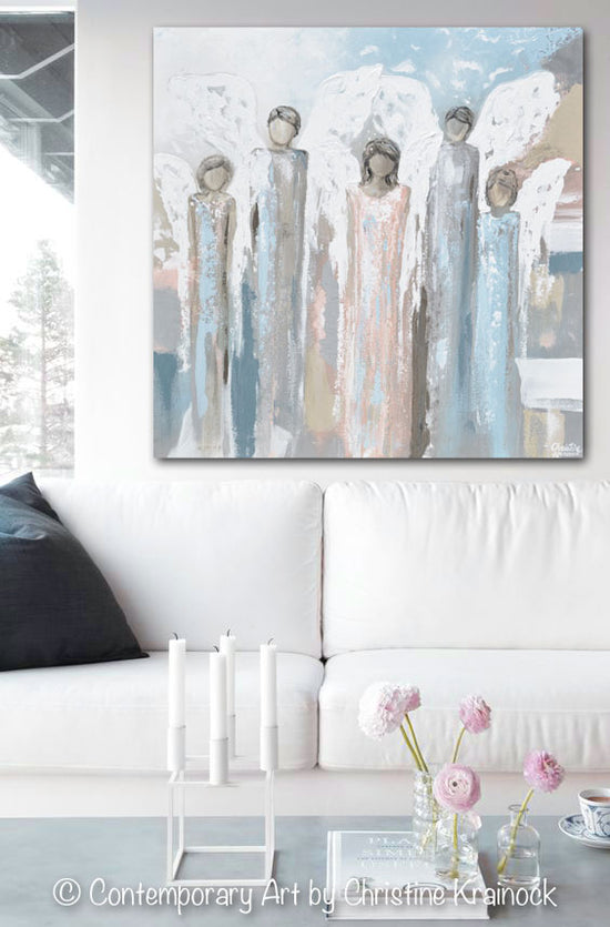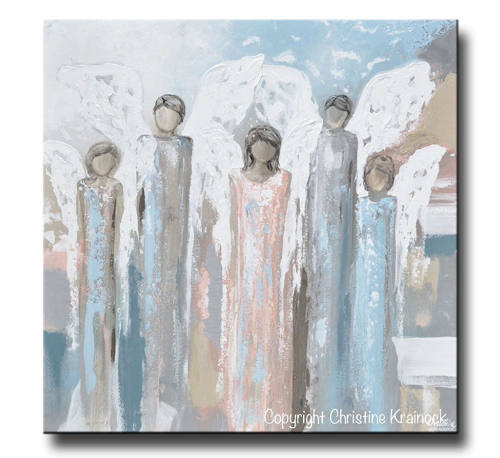 ORIGINAL Art Angels Painting Fine Art Abstract Five Angels Grey White Beige Blue Pink Modern Home Wall Decor X Large 36x36"
