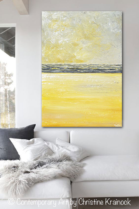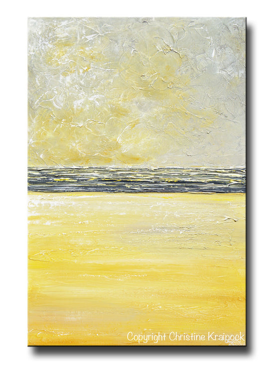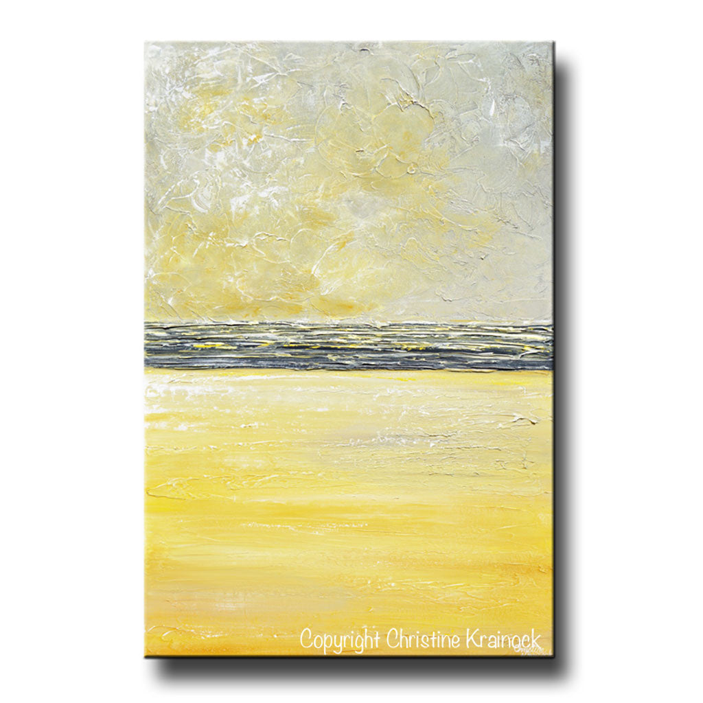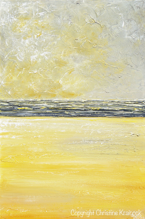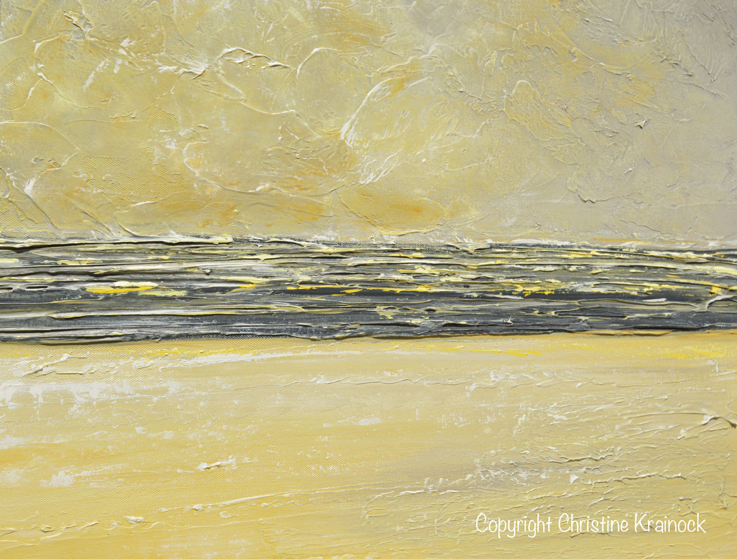 "Inner Warmth" Original Yellow Grey Abstract Painting Coastal Artwork Contemporary Modern Textured Palette Knife Paintings. Stunning coastal horizon abstract with wonderful texture and a pure feeling of light and peace. White, grey, yellow, gold, gallery fine art, wall decor. Mixed media acrylic original painting on 24x36x1.5" Gallery wrapped canvas. Can be hung vertically or horizontally.- Hand-painted, one-of-a-kind. Beautiful, vibrant, wonderful texture! The sides of the canvas are painted black so your new painting is ready to hang! The visual quality of this textured, painting is stunning in both indoor, and natural light. Each painting purchased comes with a signed and dated Certificate of Authenticity verifying that this is an original piece of art created by internationally collected artist, Christine Krainock.
