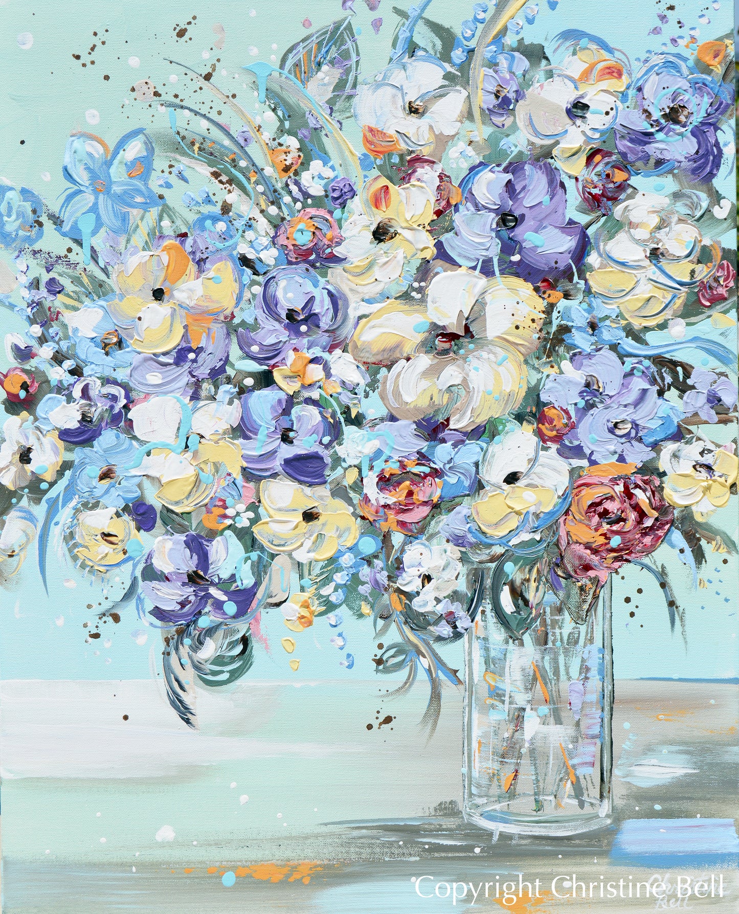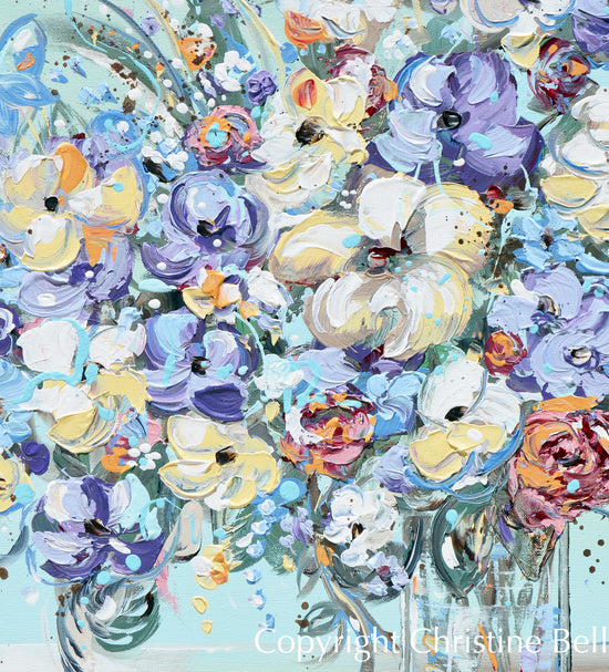 "Petals of Joy" Original Abstract Floral Flower Bouquet Painting. Contemporary Textured, Impasto Flowers, Impressionistic Fine Art. Modern Palette Knife Painting. Stunning abstract of overflowing wildflowers / poppies, with modern palette of light blue, lavender, orange, peach, mint green, grey, cream, pale yellow and white. These romantic, abstract flowers with a modern palette, possessing an elegant, casual sophistication, which draws the viewer in. It is a perfect gift for a loved one, and will enhance any decor. Abundantly blossoming romantic wildflowers, seem to overflow off of the canvas in this contemporary floral piece. Gallery fine art, wall decor. Mixed media acrylic original painting on a 24x30x1.5" gallery wrapped canvas. Hand-painted, one-of-a-kind. Beautiful, vibrant, wonderful, unique technique! The sides of the canvas are painted grey so your new painting is ready to hang! (Sides can also be black if that better matches your taste.)  The visual quality of this textured, painting is stunning in both indoor, and natural light. Each painting purchased comes with a signed and dated Certificate of Authenticity verifying that this is an original piece of art created by internationally collected artist, Christine Bell, (formerly Christine Krainock).