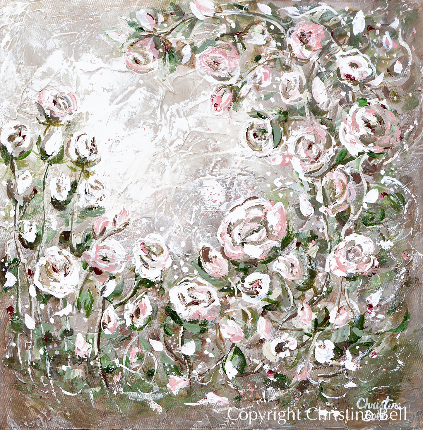 "Petites Fleurs" Original Abstract Floral Painting Pink Roses Flower Garden Fine Art. Modern, expressionist delicate flowers painting. Stunning abstract floral containing movement and light, with contemporary neutral palette of blush pink, rose, taupe, brown, green, grey, cream, and white. These romantic, sweet flowers possess an elegant, casual sophistication - is a perfect gift for a loved one, and will enhance any decor. Abundantly blossoming flowers, romantic roses, seem to overflow from their surroundings as the eye follows the lines and flow of this piece. Gallery fine art, wall decor. Mixed media acrylic and oil pastel original painting on a 20x20x1.5" gallery wrapped canvas. Hand-painted, one-of-a-kind. Beautiful, vibrant, wonderful, unique technique! The sides of the canvas are painted grey so your new painting is ready to hang! (Sides can also be black if that better matches your taste.)  The visual quality of this textured, painting is stunning in both indoor, and natural light. Each painting purchased comes with a signed and dated Certificate of Authenticity verifying that this is an original piece of art created by internationally collected artist, Christine Krainock.
