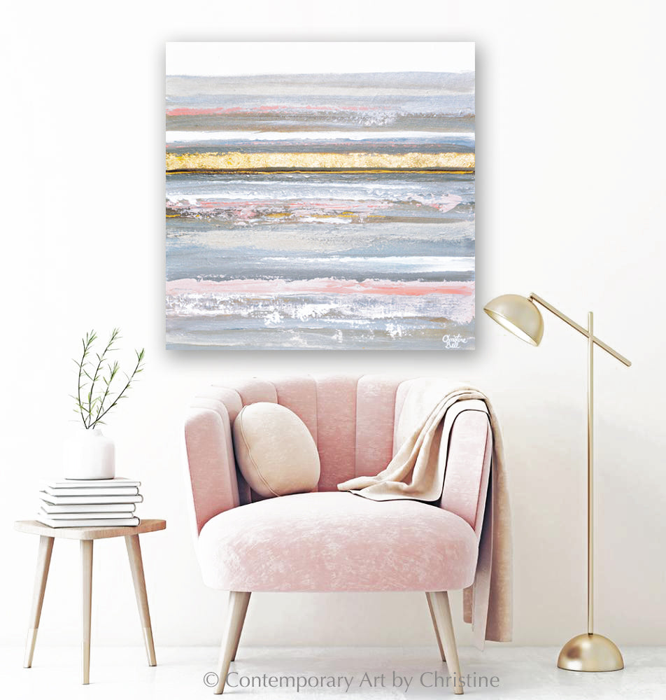 "Rose Gold II" Original Art Abstract Painting HIGHLY TEXTURED Neutral Fine Art in natural shades of white, pink, grey, warm beige, taupe with gold leaf accents. Contemporary wall art, modern coastal home decor with a natural stone effect giving this fine art piece an authentic, organic feel. Hand-painted, original painting with a calm, serene coastal feel of stone, earth and sea. Inspired by the pure colors, light and textures found within the California "Gold" Coast. This painting's gold leaf accents reflect both natural and directed light in such a way that it completely captures the viewer. Mixed media acrylic on a large 24x24x1.5" gallery wrapped canvas. Hand-painted, one-of-a-kind. Beautiful, vibrant, wonderful feel! The sides of the canvas are painted grey, so your new painting is ready to hang! (Sides can be painted black if it better suits your tastes.) The visual quality of this textured, painting is stunning in both indoor, and natural light. Each painting purchased comes with a signed and dated Certificate of Authenticity verifying that this is an original piece of art created by internationally collected artist, Christine Bell, (formerly Christine Krainock).
