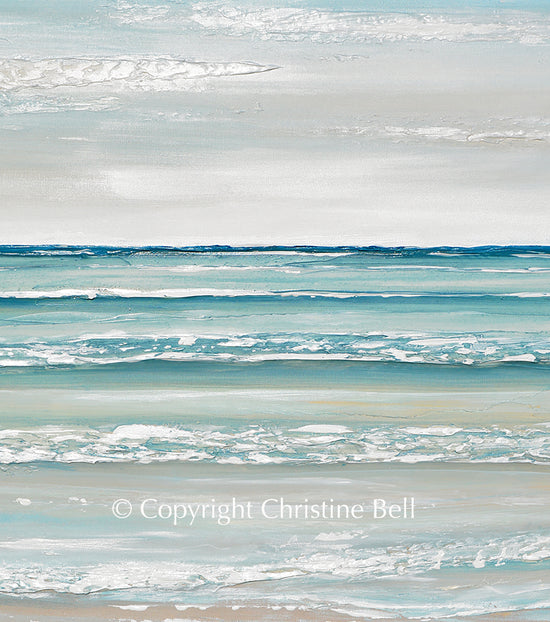 "Seaside Memories" Original Art Abstract Painting Textured Seascape. Stunning, large 48x30" modern, abstract Impressionism painting of the ocean, waves and beach. The serene shades of fresh soft aqua blues, crisp white, and the multiple layers of paint seem to take on the texture, depth and relaxed feel of the coast, sea and gentle waves in impressionistic form. Contemporary, modern, California, coastal, gallery fine art. Beautiful ocean seascape, landscape, large, wall art, perfect for contemporary coastal style / modern home decor. Modern, highly TEXTURED, palette knife painting with serene light blue, pale aqua blue, cream, grey, sandy beige, and white, with wonderful layers giving this piece a modern yet peaceful effect.