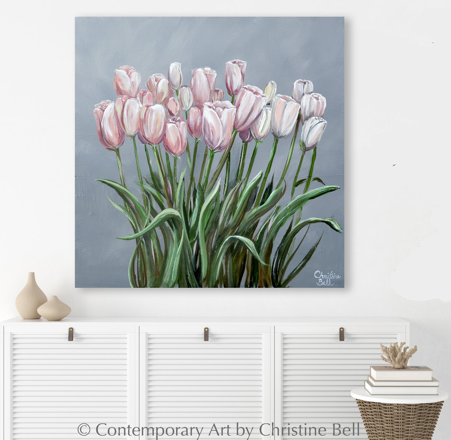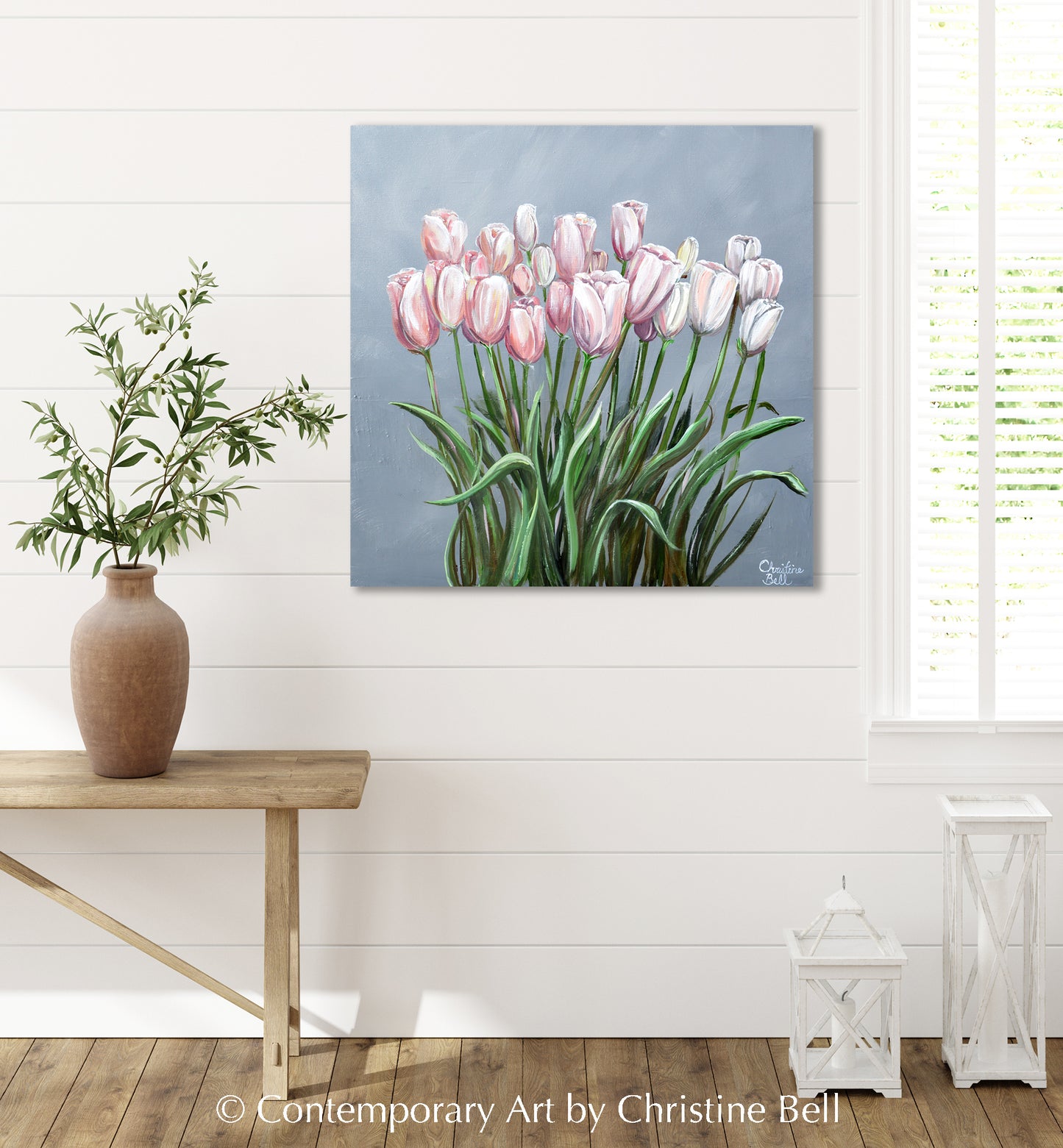 "Tip Toe Through the Tulips" Original Art Floral Oil Painting. Modern Botanical Fine Art depicting large pink and white tulip flowers blossoming in spring. The flowers have an almost 3-D realism effect, creating an absolutely gorgeous oil painting. Inspired by springtime tulips in bloom, this modern, expressionist, realism floral painting is painted in serene shades of fresh blush pinks, peach, rose, soft yellow, green and white on a soft blue/grey background. Contemporary, modern, expressionism, gallery fine art. A stunning, beautiful piece of artwork perfect for contemporary coastal style / modern home decor.